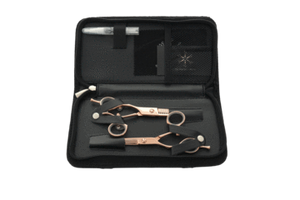 Die Modellierschere in diesem Set ist etwas Besonderes, da sie eine so genannte "Bevel Edge" Modellierschere ist. Dies bedeutet, dass sie einen wesentlich saubereren Schnitt bietet, der das Haar schützt und sich das Haar, im Vergleich zu Schnitten mit herkömmlichen Modellierscheren, super glatt anfühlt.