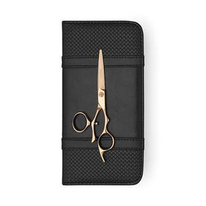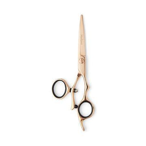 Die 5,5" Zoll roségoldene Friseurschere mit beweglichem Daumenauge ist mit ihrem einzigartigen Griffdesign perfekt, um Schmerzen im Handgelenk zu reduzieren und vorzubeugen.